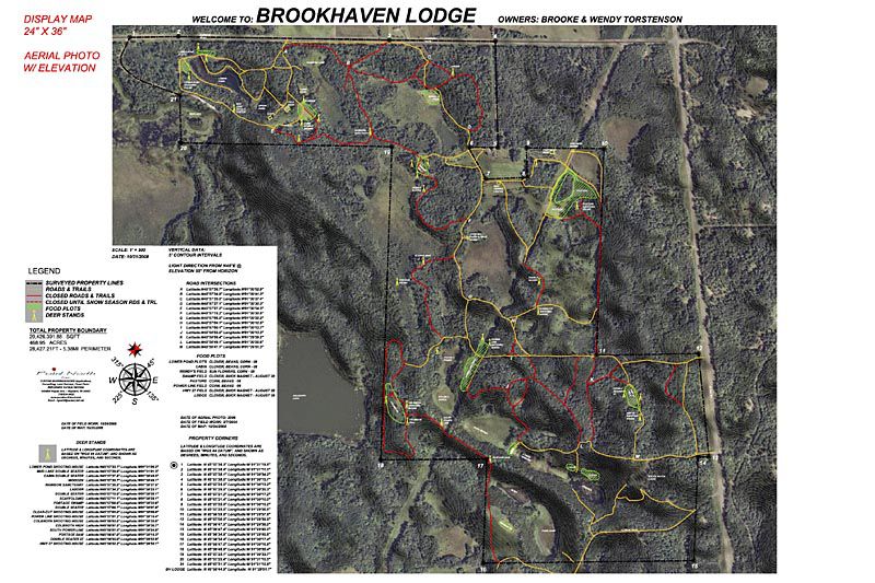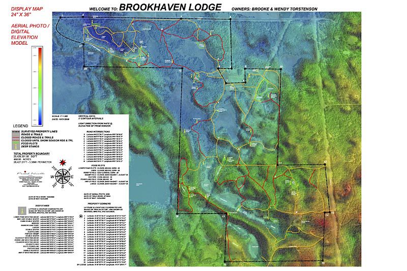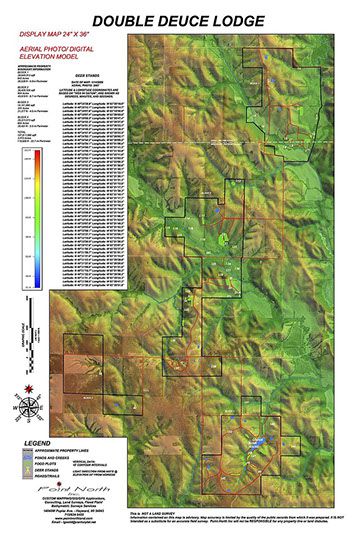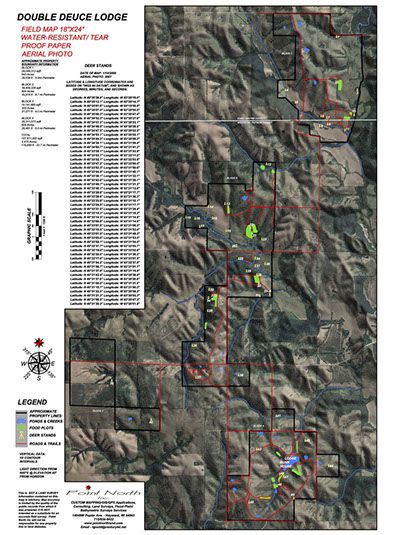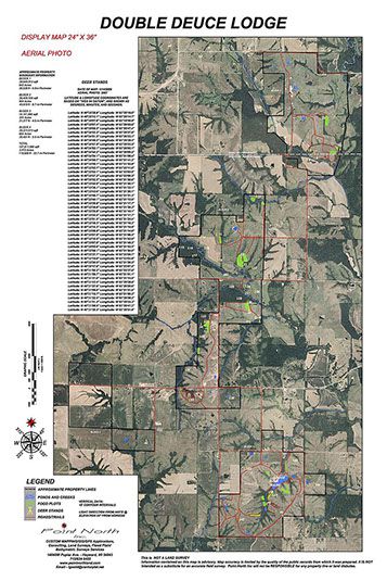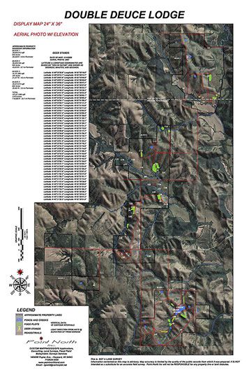 Display maps can be framed in glass and displayed at the lodge for use in planning activities for that day. This preparation by the landowner will enhance the ease of land management by highlighting the locations of deer sanctuaries, trespass areas, occupied hunting stands and open or closed trails and roads.